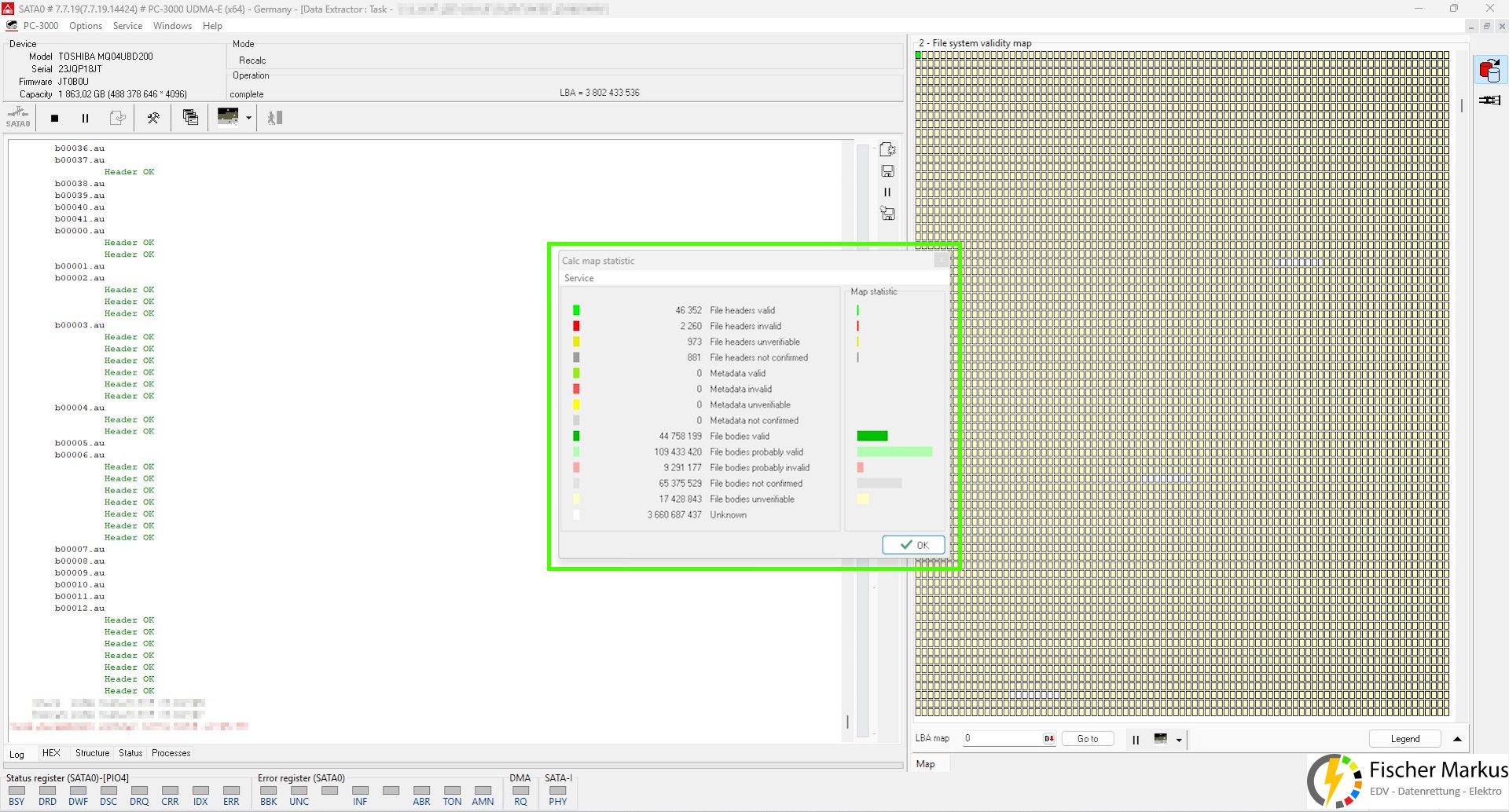 Es wurde eine sog. „Map of used sectors“ erstellt, um festzustellen wie viele Sektoren tatsächlich mit Nutzerdaten belegt sind und welche Daten welchem Schreib-/Lesekopf zugeordnet sind.