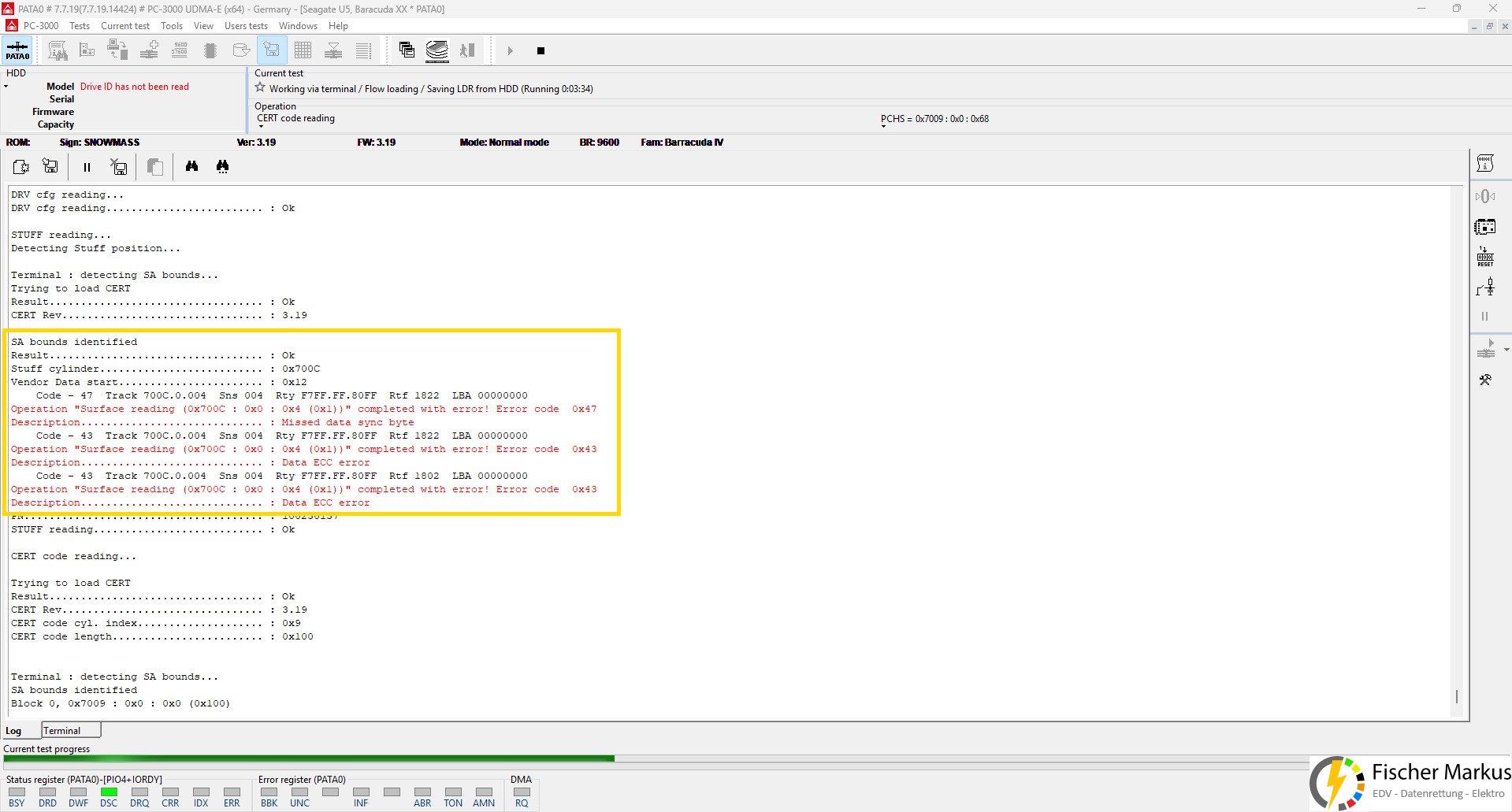 Mittels Spezialhard-/ und Software vom Marktführer ACELab (PC-3000 UDMA System) war ein Zugriff auf wichtig Festplattendaten und auch auf die Service Area möglich. Tatsächlich war hier ein Problem, welches aber umgangen werden konnten.